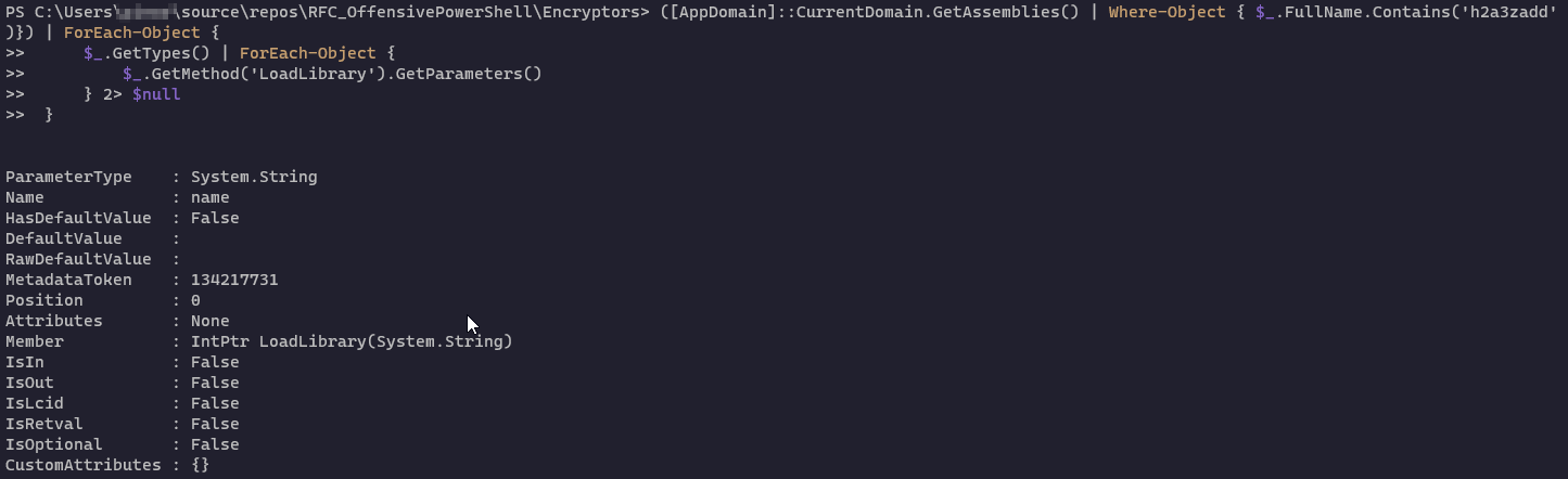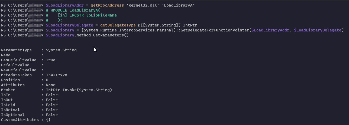 $LoadLibrary = [System.Runtime.InteropServices.Marshal]::GetDelegateForFunctionPointer($LoadLibraryAddr, $LoadLibraryDelegate)