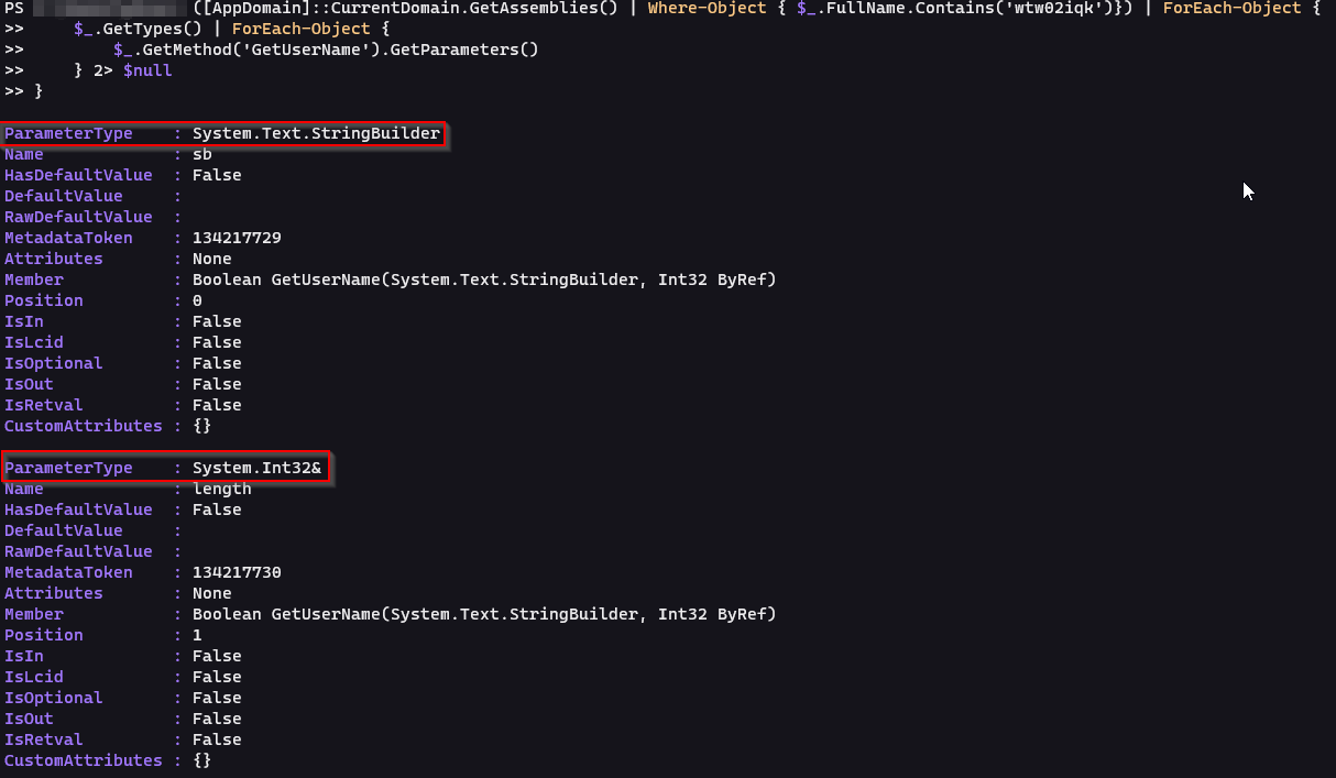 $GetUserNameDelegationType = getDelegateType @([System.Text.StringBuilder], [Int].MakeByRefType())